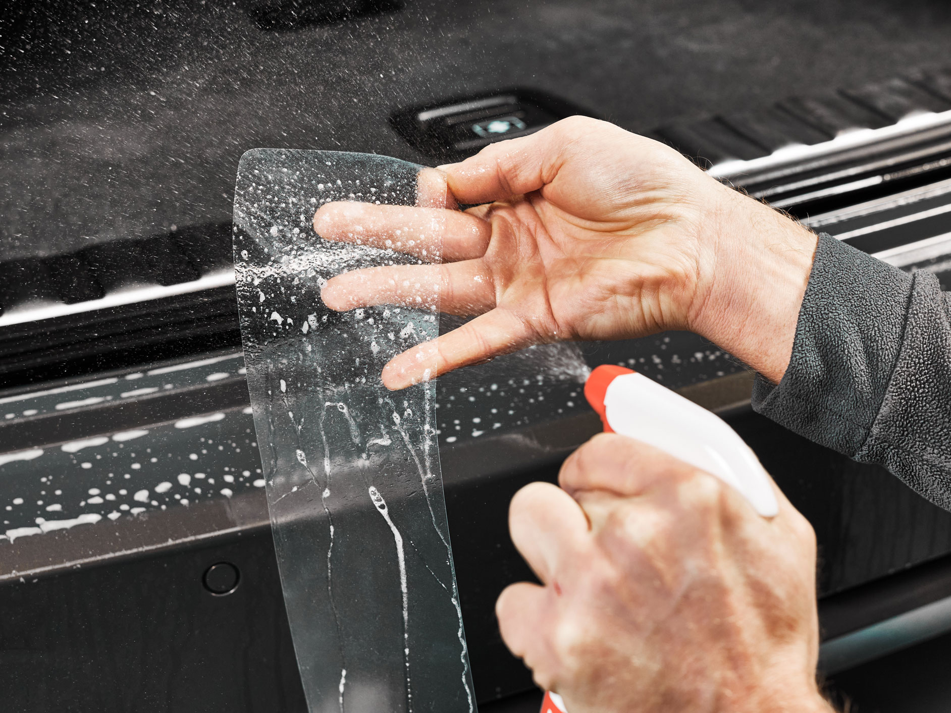 Lösen Sie die Folie vorsichtig mit sauberen und angefeuchteten Fingern vom Trägerpapier ab. Jetzt benetzen Sie die Klebeseite der Folie und die zu beklebende Lackfläche reichlich mit der Montageflüssigkeit (Abb. A). Um beim Anbringen Kratzer auf der Folie zu verhindern, befeuchten Sie die Oberseite der Folie ebenfalls reichlich mit der Flüssigkeit. Nur bei einem Rakel ohne Filzkante: Umwickeln Sie diesen zum Schutz der Folie mit einem Küchentuch.