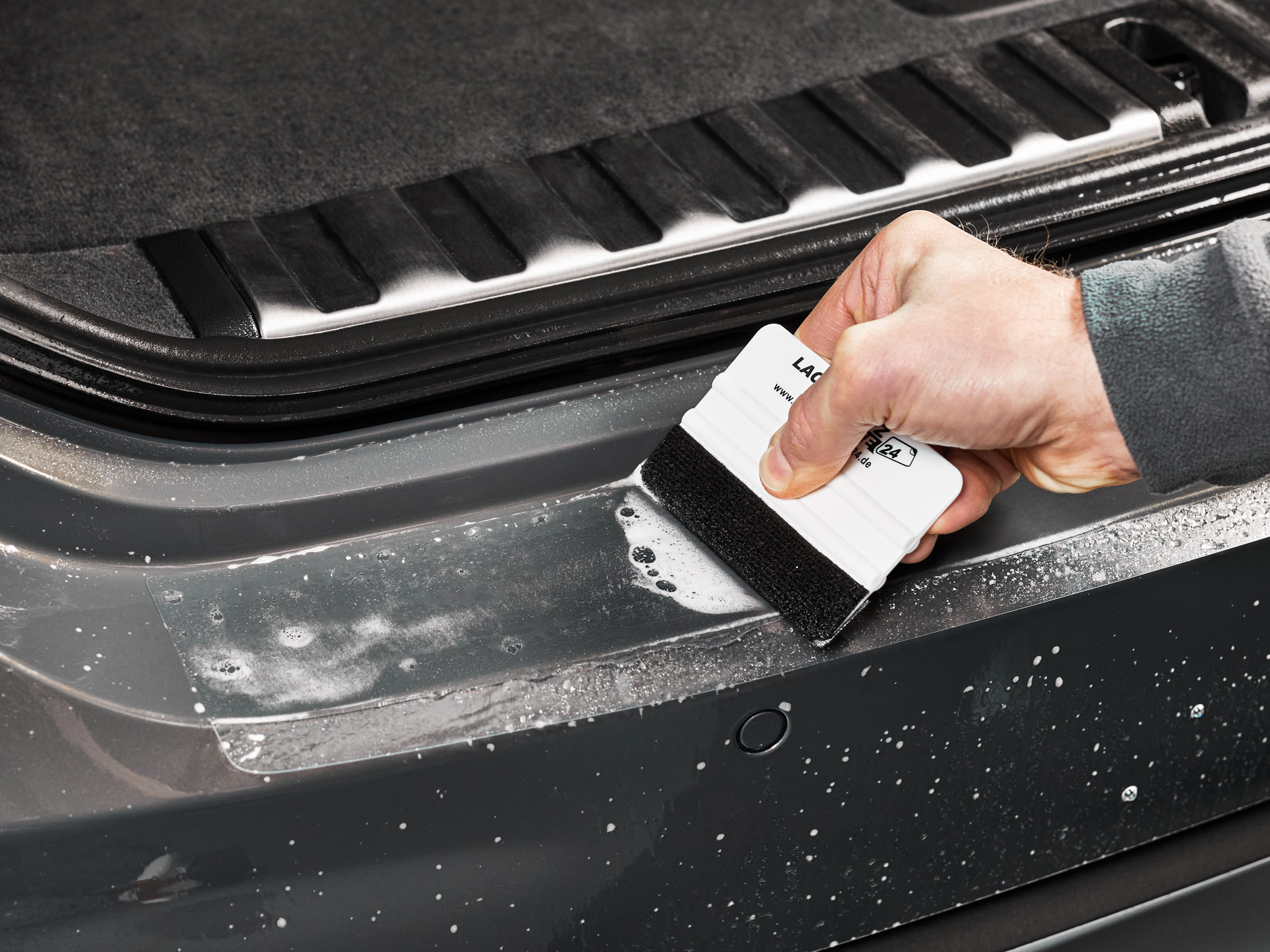 Hinweis für die Ladekantenschutzfolie Transparent Glatt Hochglänzend - 240μm stark: Aufgrund der Materialstärke muss bei dieser Folie mit hohem Druck (beim Ausstreichen) gearbeitet werden. Um die äußere Kante herum lässt sich die Folie mit Hilfe des Fingers präzise umlegen - ggf. Folie in diesem Bereich mit Hilfe eines Föns leicht erwärmen.