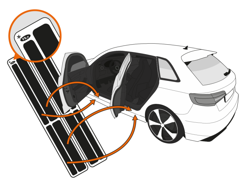 Die Montage der Einstiegsleistenschutzfolie erfolgt genau wie in unserer allgemeinen Montageanleitung beschrieben. Bitte beachten Sie für die korrekte Zuordnung der Einstiegsleistenschutzfolie: Auf dem Folienbogen für die Fahrerseite ist stets eine Kennzeichnung angebracht (FS / FS,v = Fahrerseite vorn). Die Anordnung der Folien entspricht der Draufsicht Ihres Fahrzeuges - d.h. der Folienbogen mit Kennzeichnung (FS / FS,v) wird auf der Fahrerseite angebracht. Der andere Folienbogen wird in der gleichen Anordnung auf der Beifahrerseite montiert.