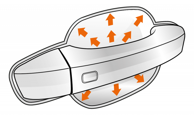 Reinigen Sie die zu beklebende Griffmulde außen und innen gründlich. Benetzen Sie den Griffmuldenbereich und die Folie mit Montageflüssigkeit. Legen Sie die Schutzpads auf und streichen Sie diese mittig mit dem Finger an. Anschließend wird die Lackschutzfolie von der Mitte ausgehend in alle Richtungen vorsichtig ausgestrichen (Tipp: etwas Küchenpapier um den Finger legen). Hilfreich kann hierbei die Verwendung eines Föns sein (nicht Überhitzen, um Schäden am Fahrzeuglack zu vermeiden).